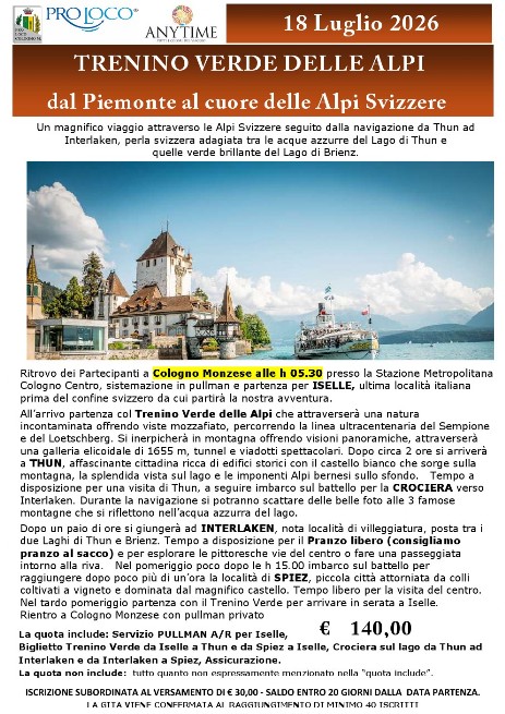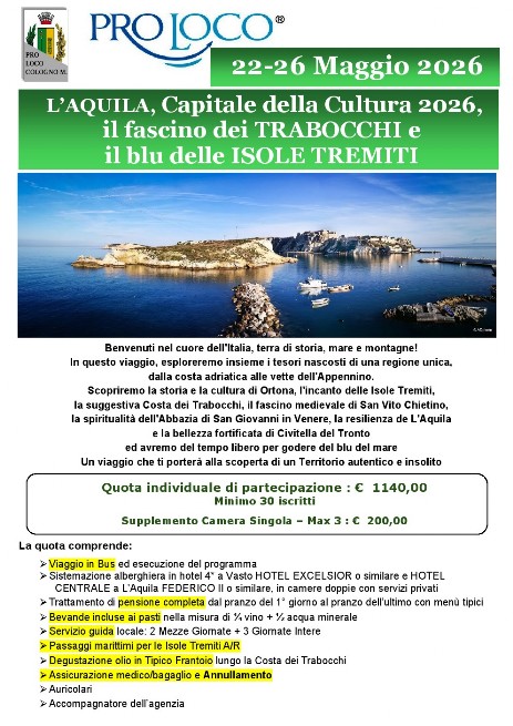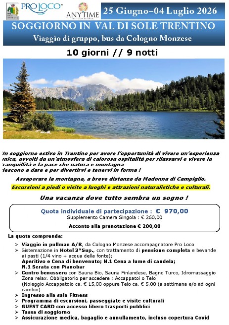 IMPORTANTE!!! All'atto della prenotazione occorre versare l'acconto come da locandina e che in caso di disdetta negli ultimi 10 giorni da parte dell'utente, il nominativo iscritto può essere sostituito con altra persona di fiducia, in caso non la si trovasse, proverà la Pro Loco a cercare altra persona se presente in lista di attesa.